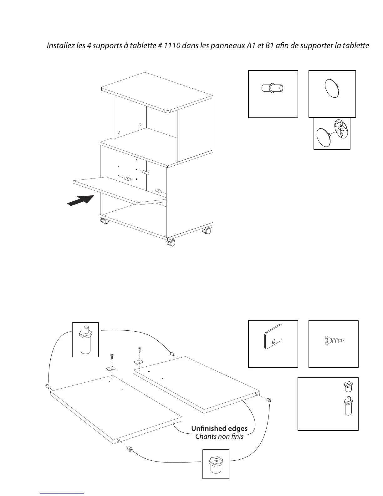Install the 4 shelf supports # 1110 into the panels A1 and B1 to support the adjustable