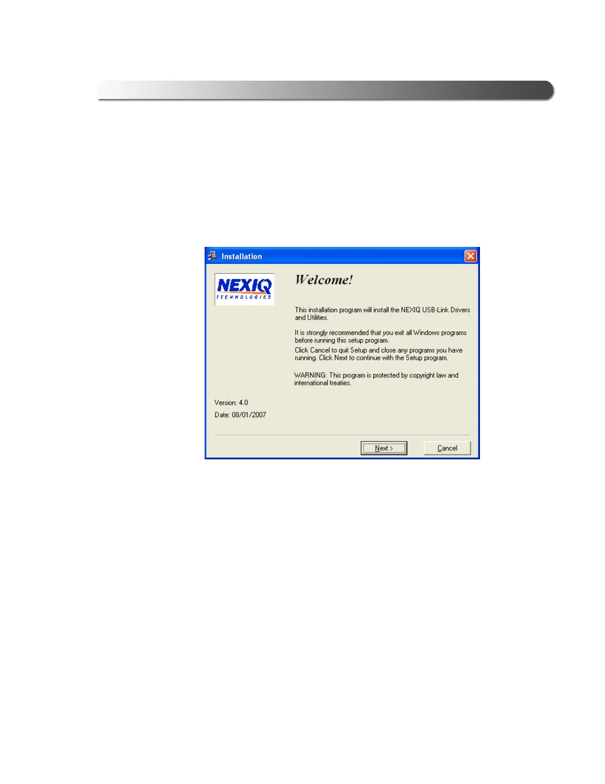 4 Read the information displayed on the Welcome! screen, and click Next.