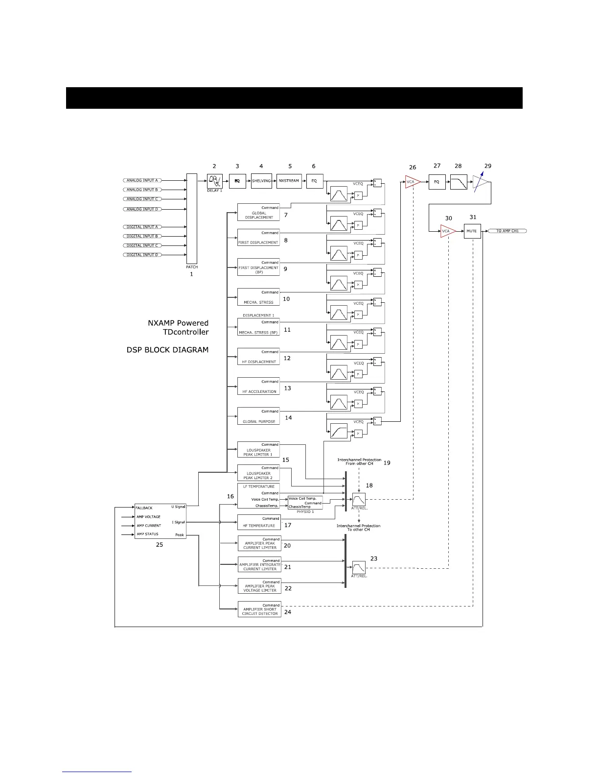 The block diagram bellow shows the global signal path inside the DSPs, for one channel