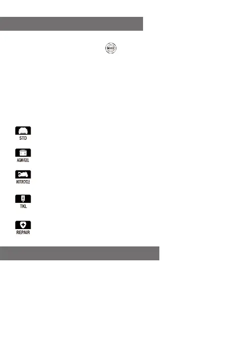1. selezionare le modalità appropriate (STD/AGM/GEL/MOTORCYCLE) per caricare