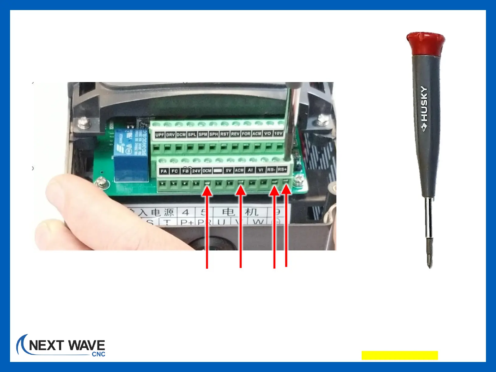 4. Use a small screwdriver to loosen terminals DCM, ACM, RS- and RS+