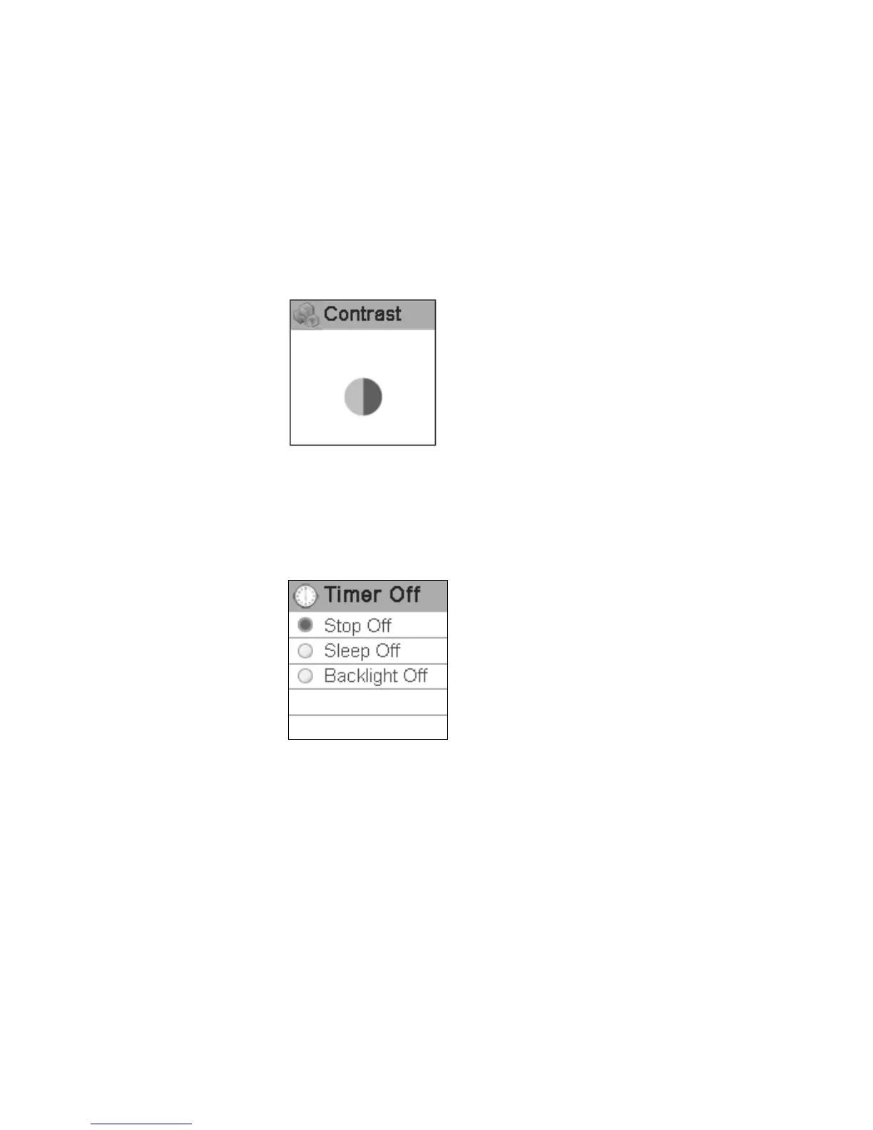 this setting. The sub menus of timing off are: stop off, sleep off and backlight off.