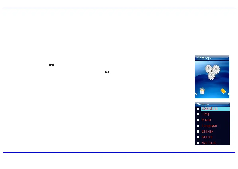 This section describes how to access and change various features through the MP3 player settings menu.