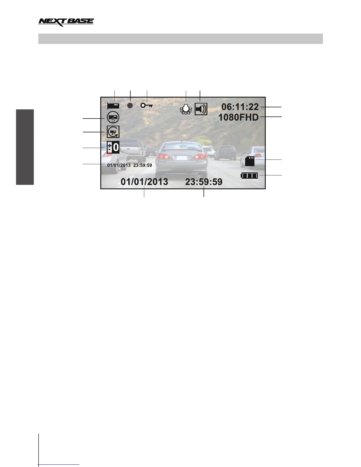 Der Schlüssel unten erläutert die verschiedenen Informationen auf dem Bildschirm, wenn Ihre iN-CAR CAM sich im