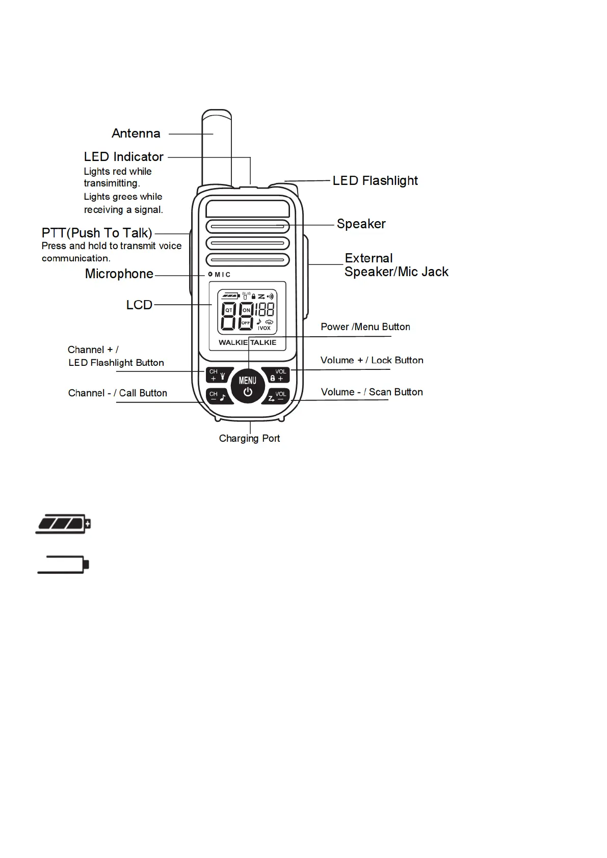 Blinks when battery is low; charge the radio or replace batteries immediately.