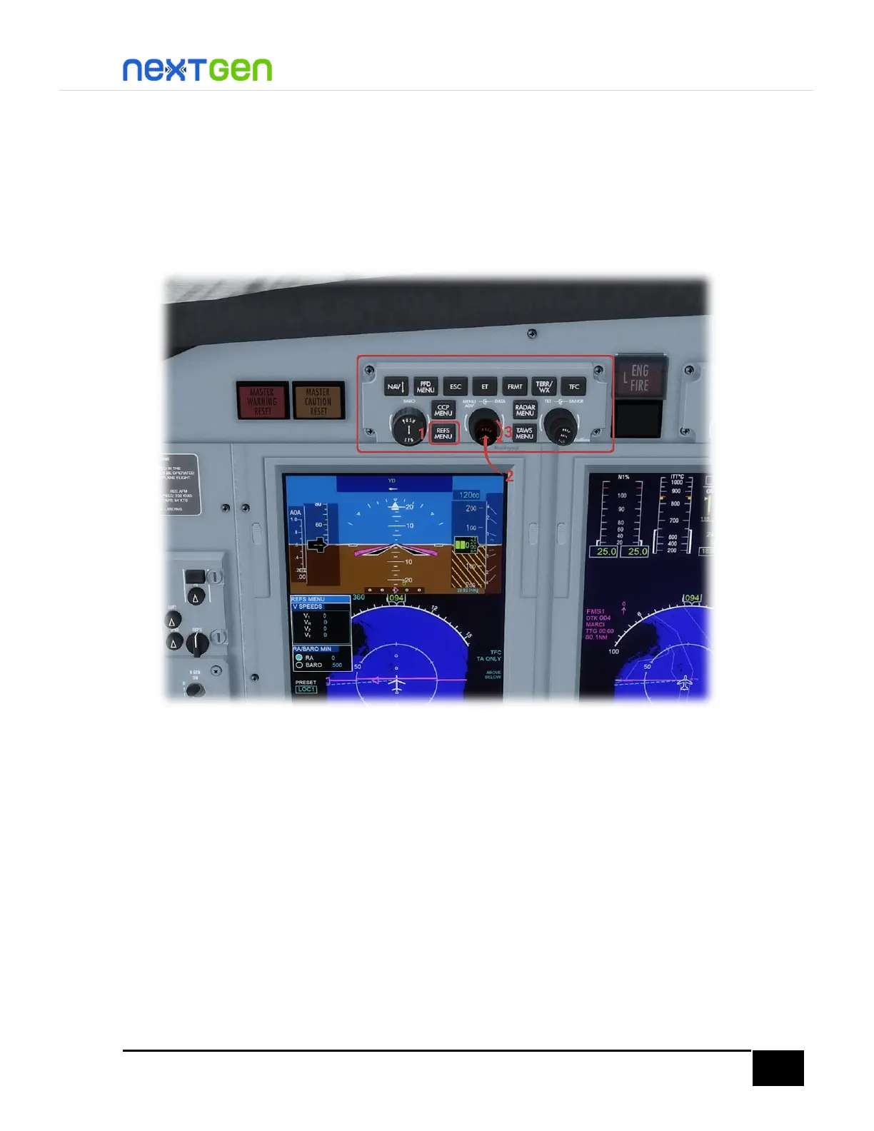 the pilot PFD and (1) press the REFS MENU button. You will see a contextual menu on the left