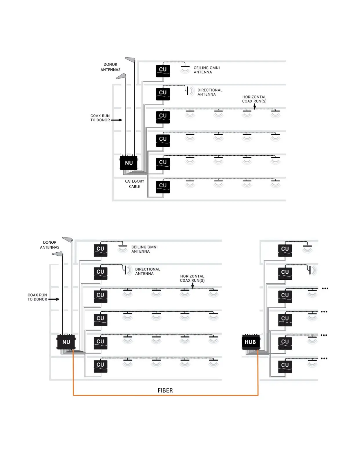 NEXTIVITY CEL-FI QUATRA EVO - Installation Architecture Examples; Figure 6: QUATRA EVO System Architecture; Figure 7: QUATRA EVO System Architecture with Fiber Hub Option