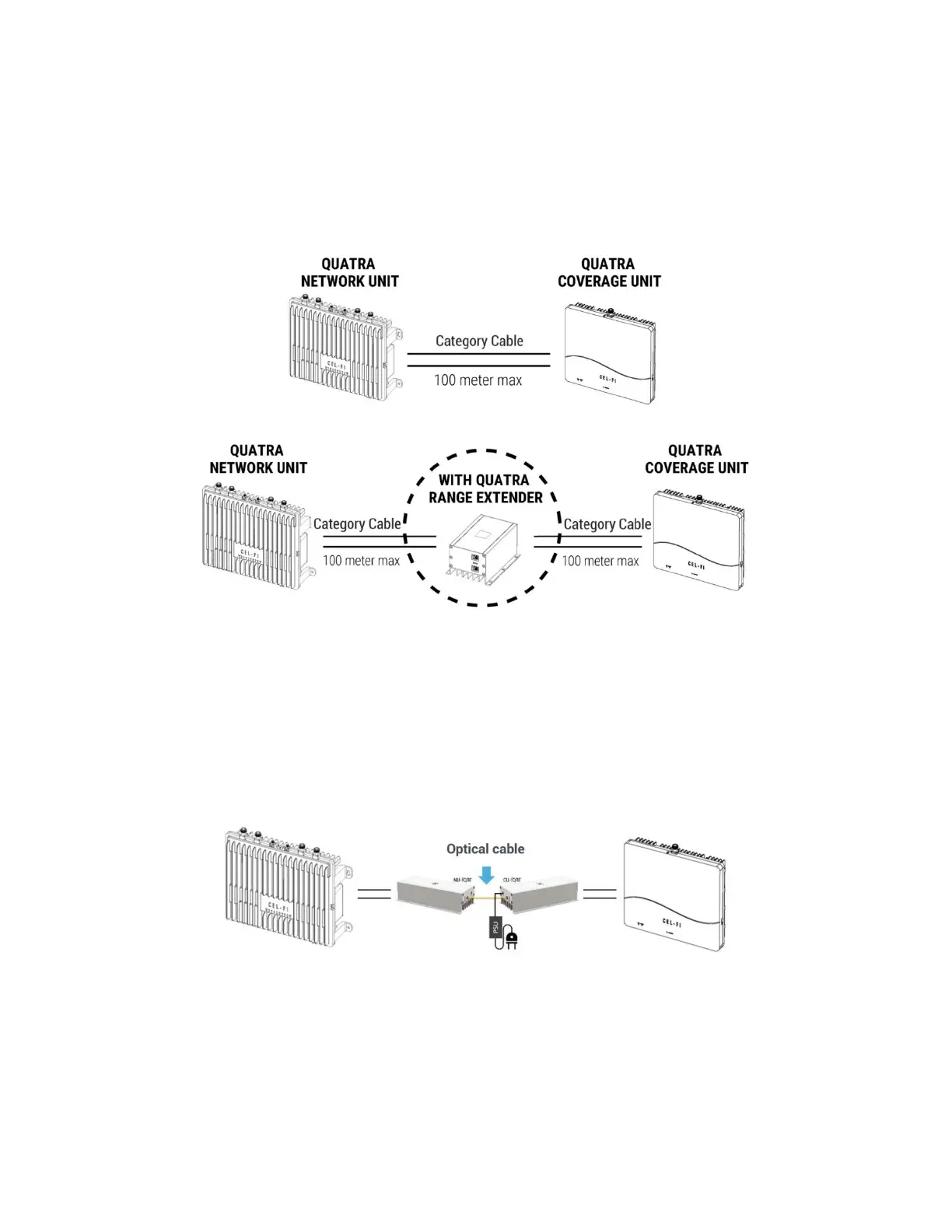 If even longer CU cables are required, use the QUATRA Fiber QRE for up to an additional 2km