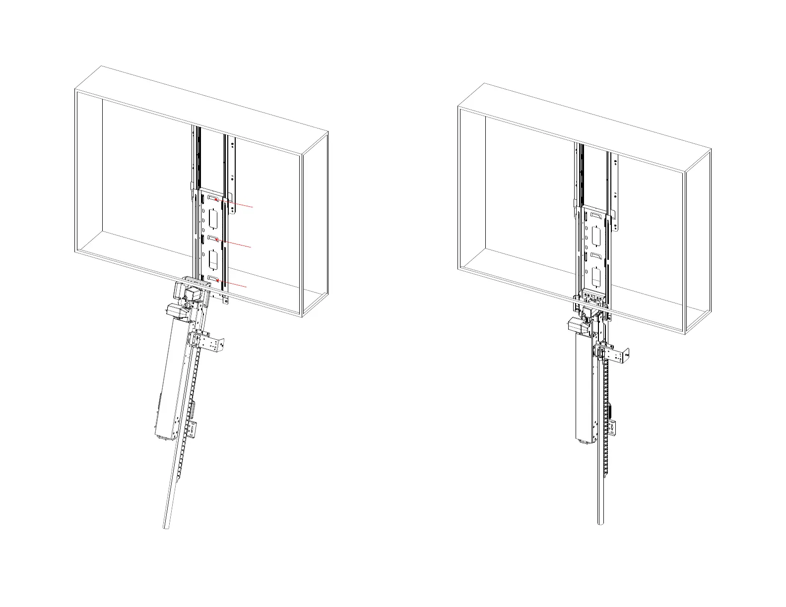 7. Using the handles on the side of the Lift Assembly, hoist the Lift Assembly onto the first set of hooks on the Installation Bracket.
