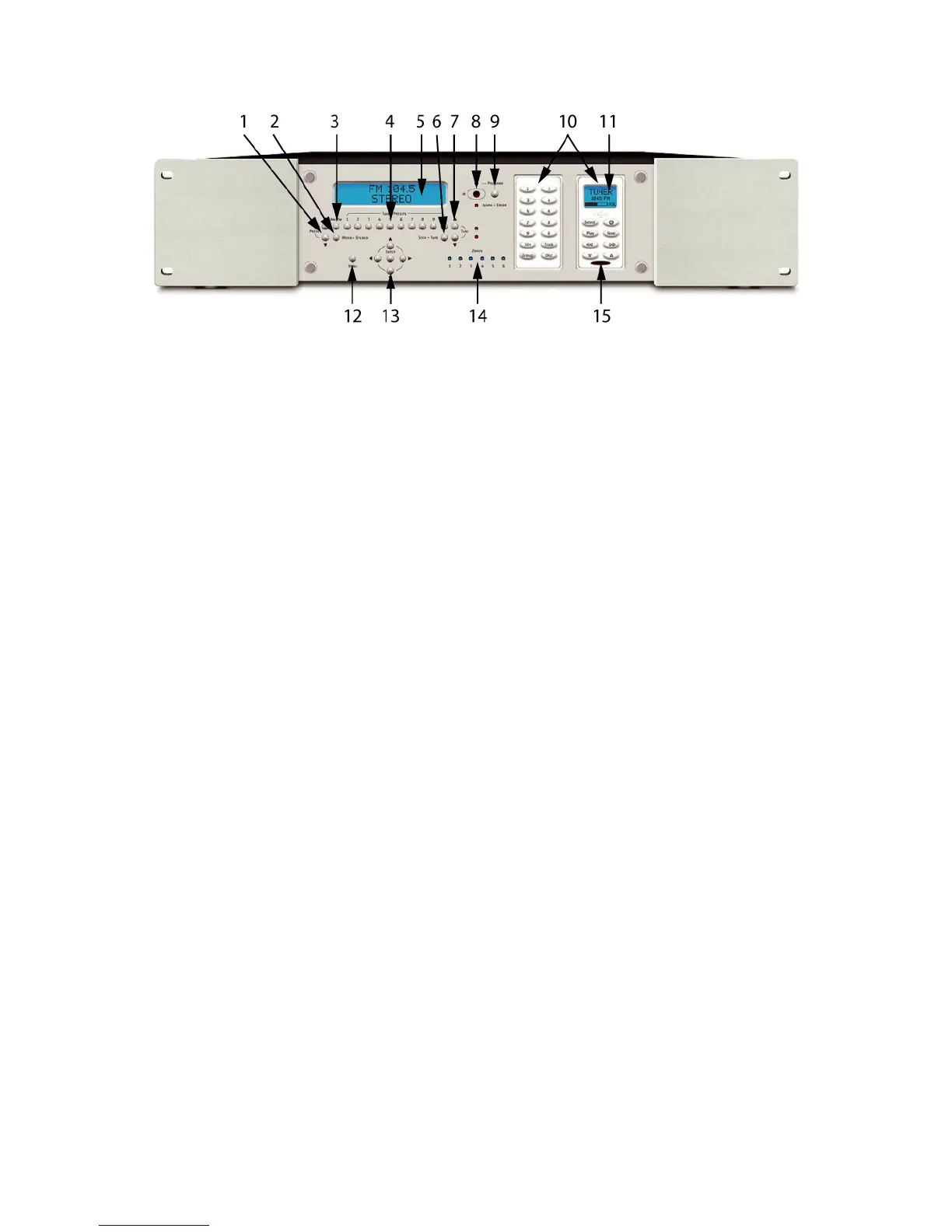 5. C-6 Controller Display – Backlit LCD provides information regarding: Tuner preset number,