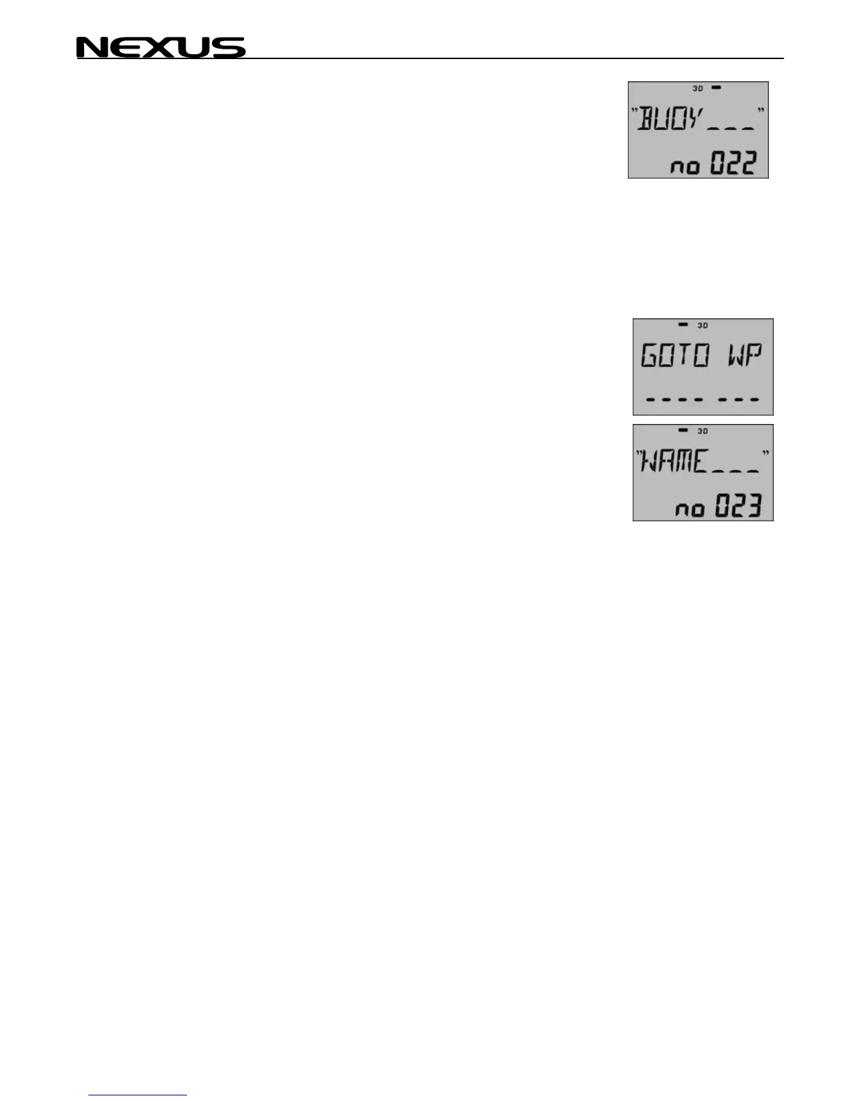 The display shows ex. "NAME" no:023 as last edited waypoint