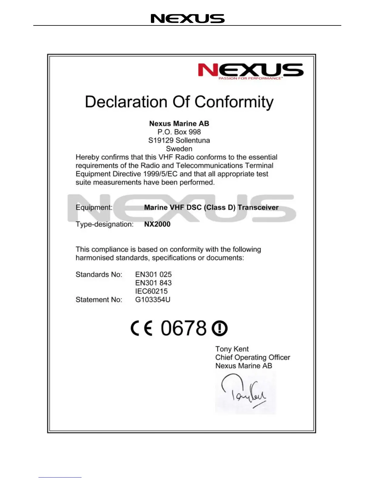 Nexus NX2000 - Declaration of Conformity Statement; Declaration of Conformity
