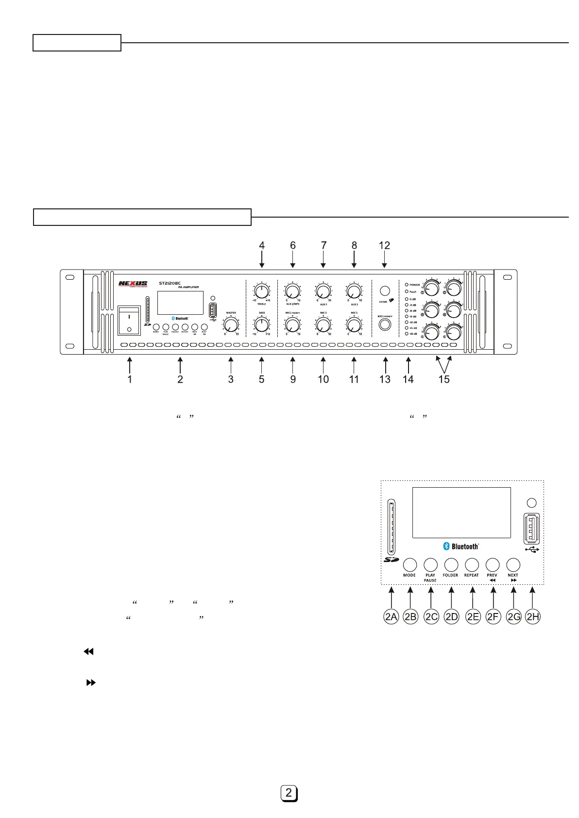 (2F) Prev/ : Push this key and release, play the previous song. In USB or SD playing mode, push it and