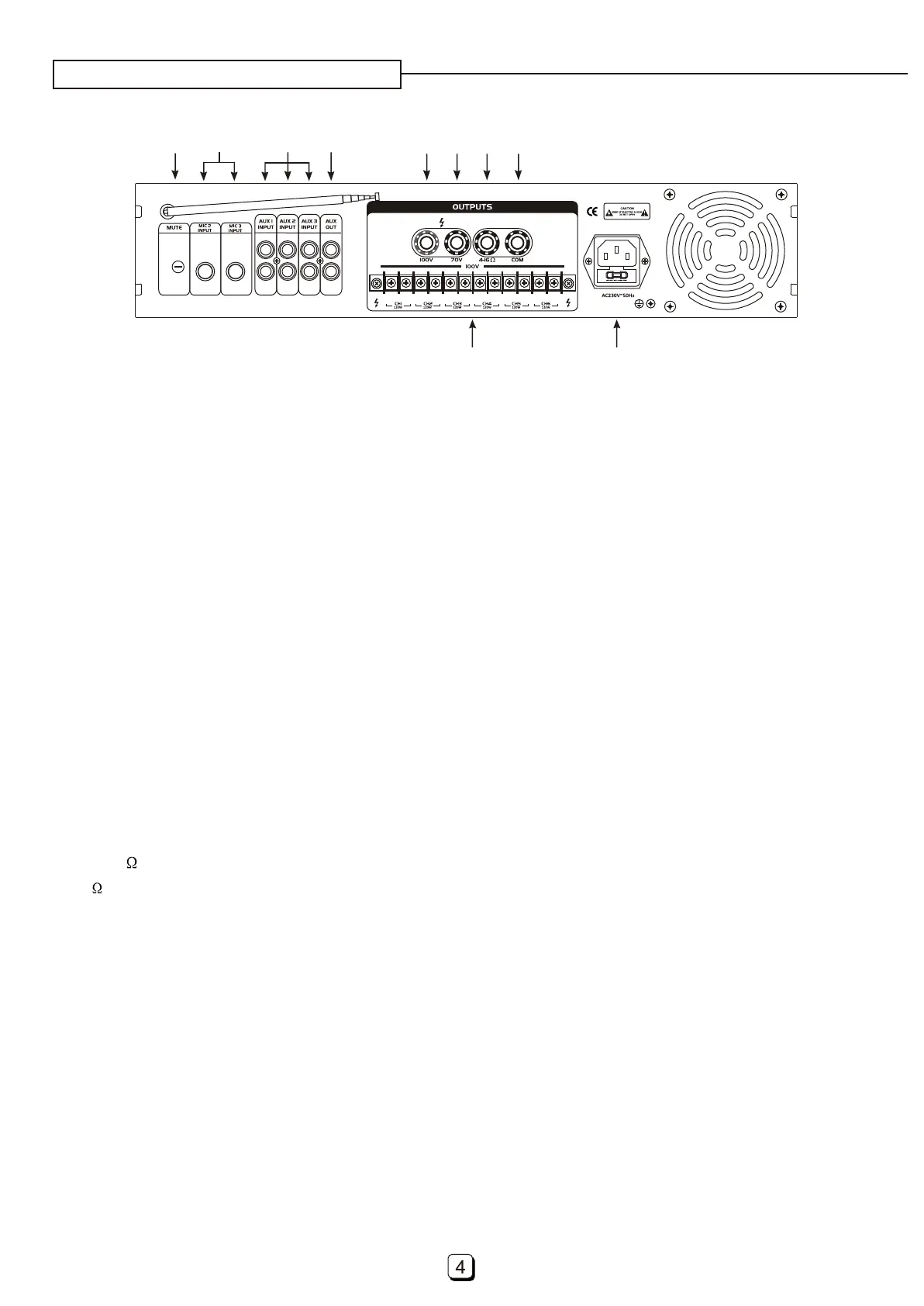 100V output binding post provides power output to your PA-speakers with maximum voltage 100V.