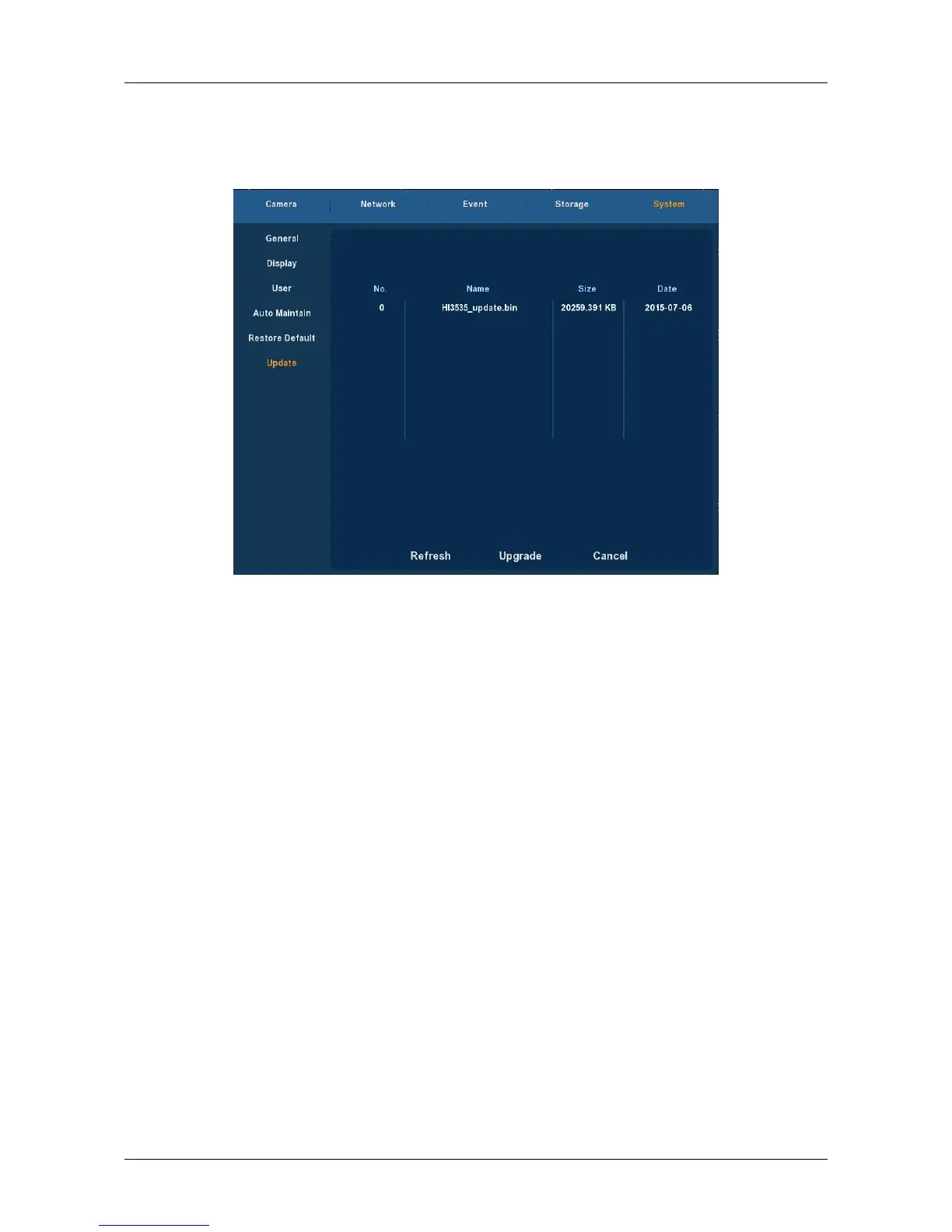 Choose ”Menu→Setup→System→Upgrade” in the Menu interface, the