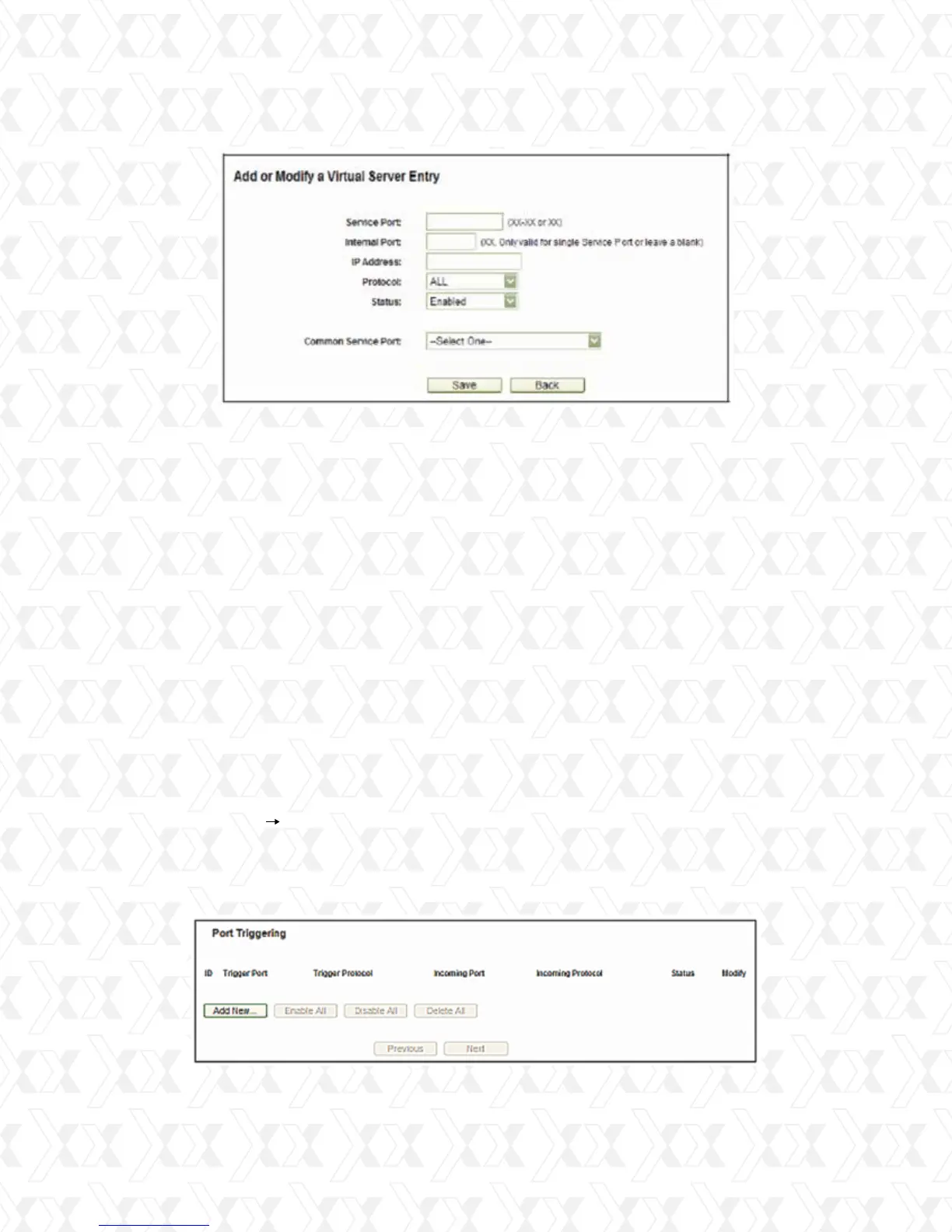 Go to Forwarding Port triggering in the menu, in order to visualize and add port trigger-