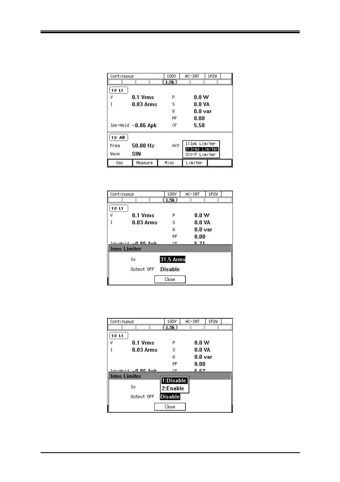Push [Limiter] soft-key to select 2:Irms Limiter (or push I key). Opens the RMS current limiter