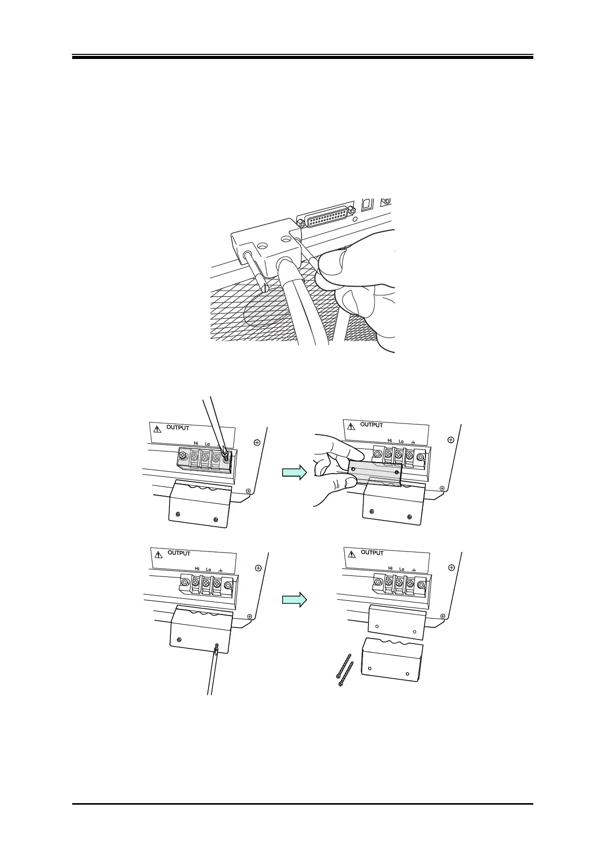 Remove the resin-molded output terminal cover and the cable holder (option) of each cabinet.