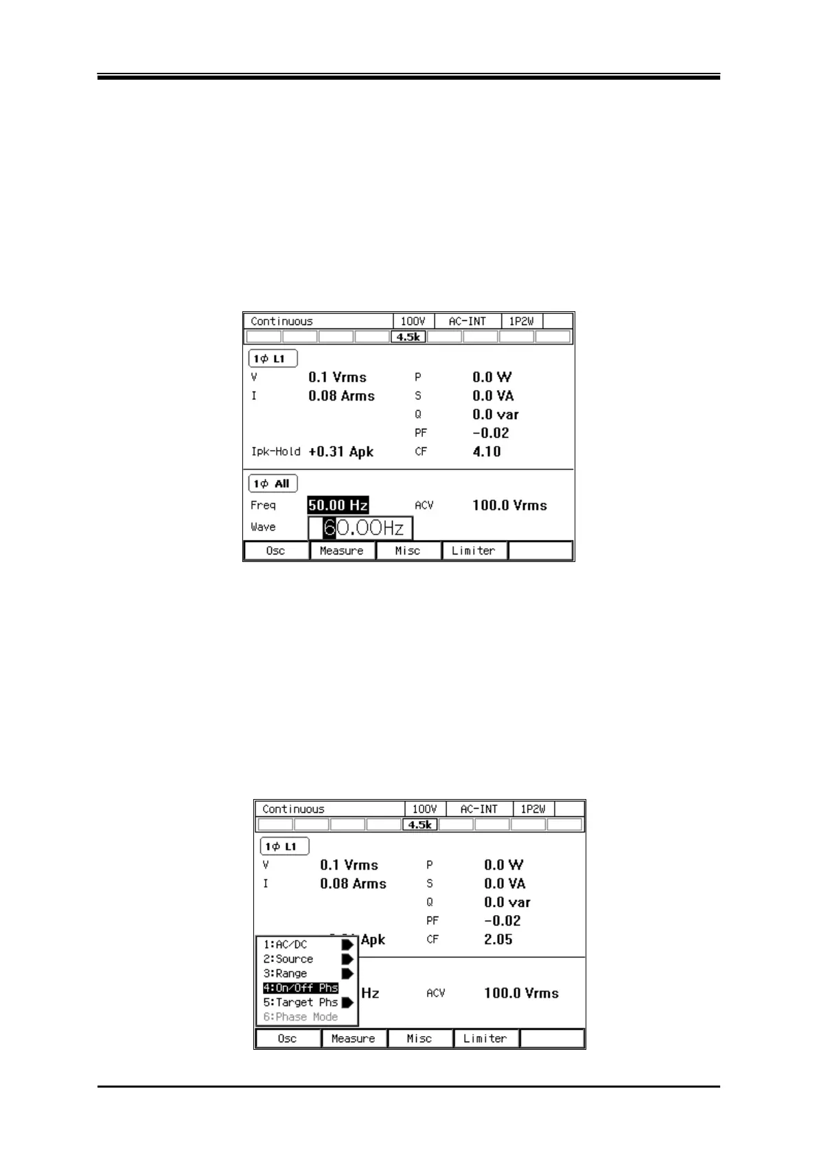 Press the [Osc] soft-key and select [4:On/Off Phs]. The output on/off phase setting window