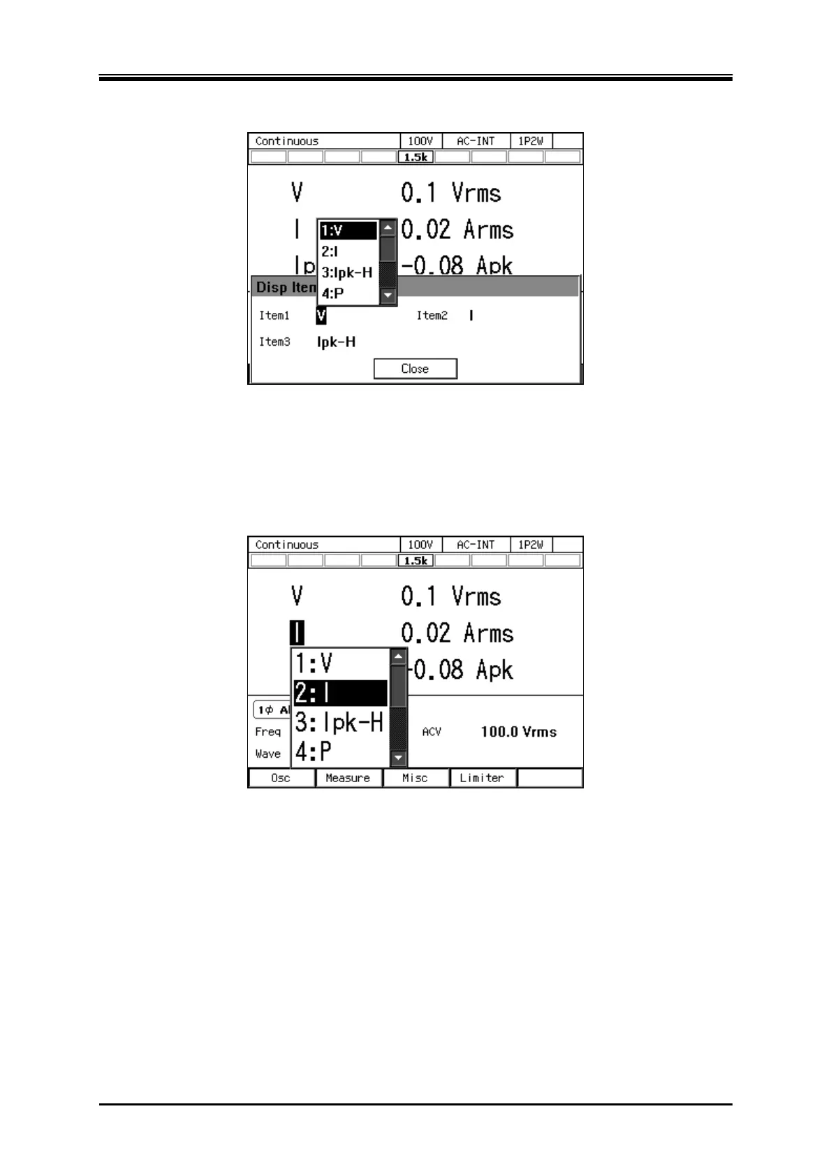 In the [Item1] to [Item3] items, select measured values to be displayed.