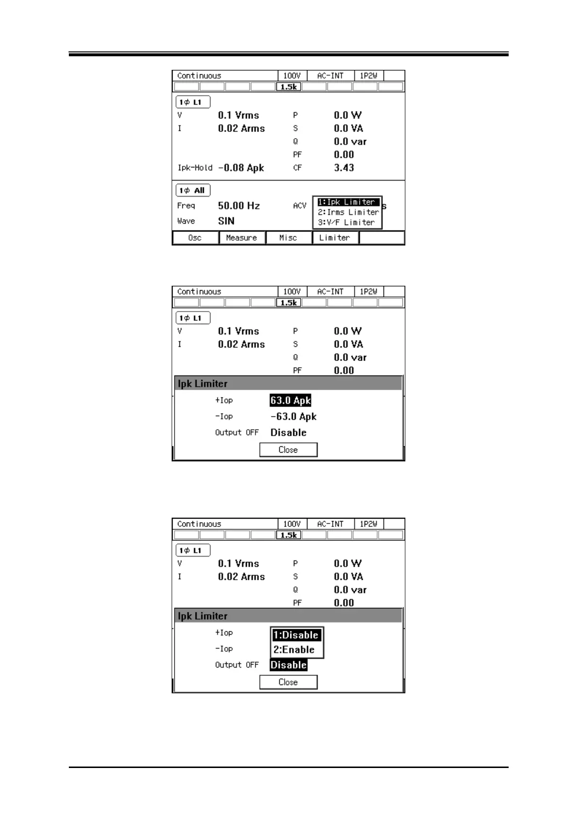 Iop] item, set the peak current limiter value of positive/negative.