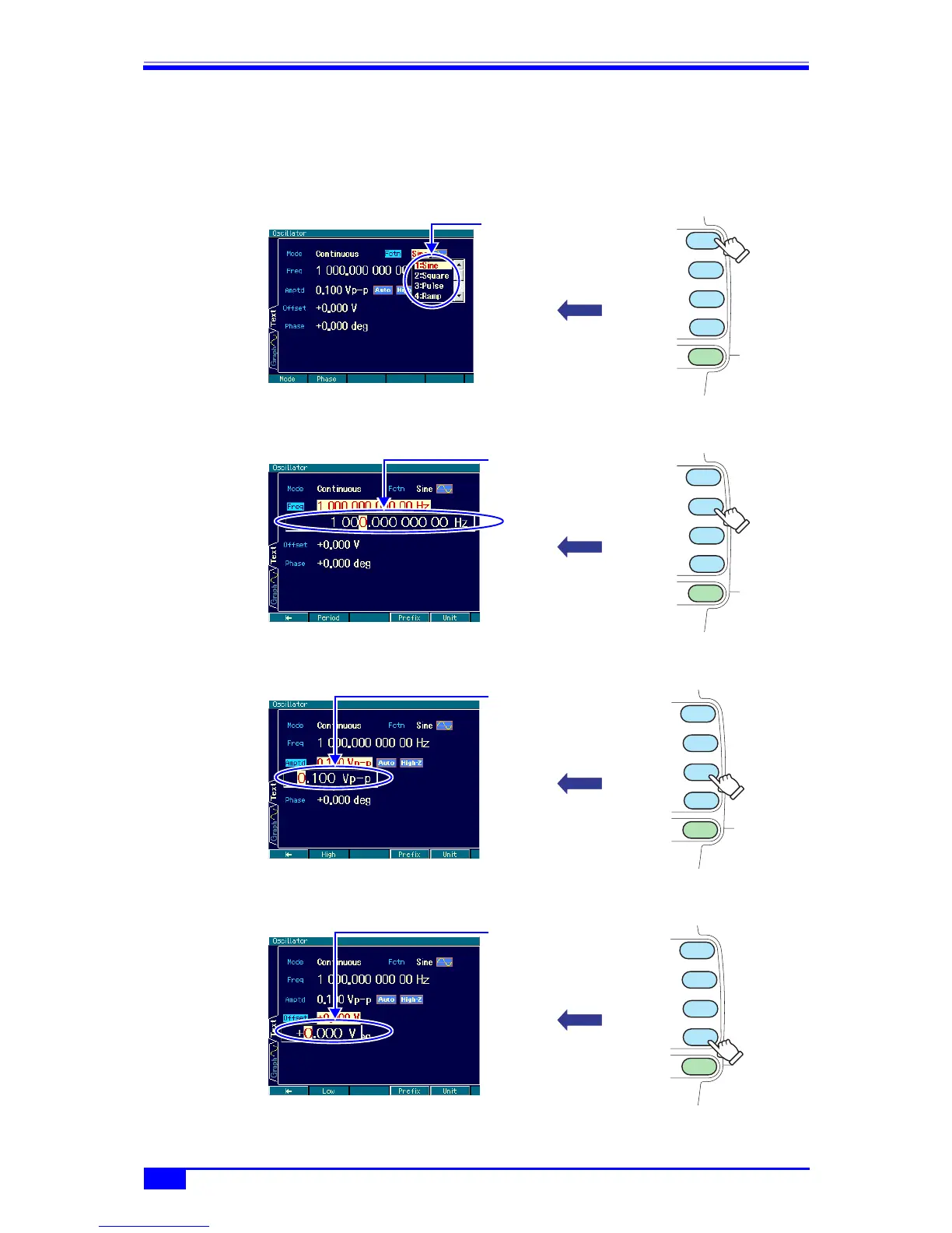 The choice list or input field for waveform, frequency, amplitude, and DC offset can be