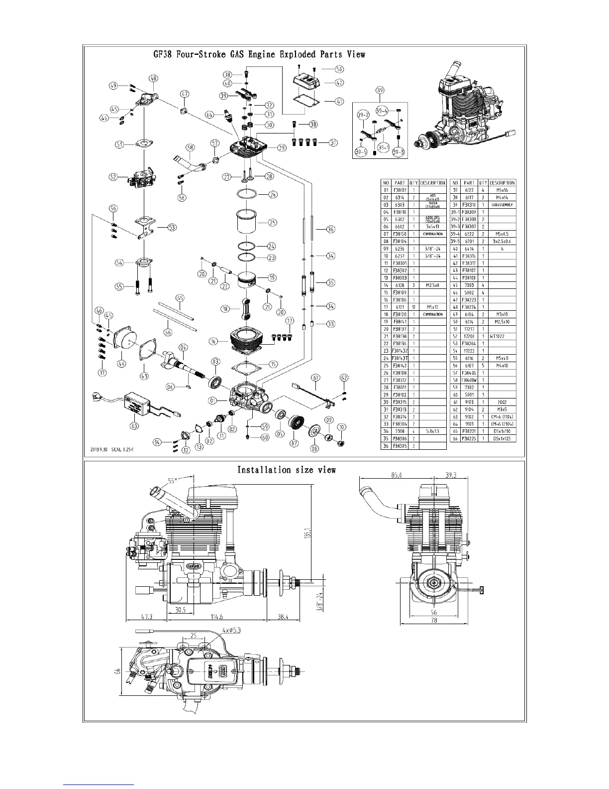 NGH GF38 - Technical Diagrams and Dimensions; Exploded View of Engine Components; Engine Installation Dimensions
