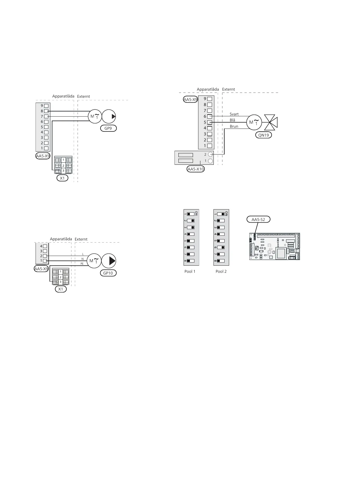 Anslut cirkulationspumpen (GP9) till AA5-X9:8 (230 V),