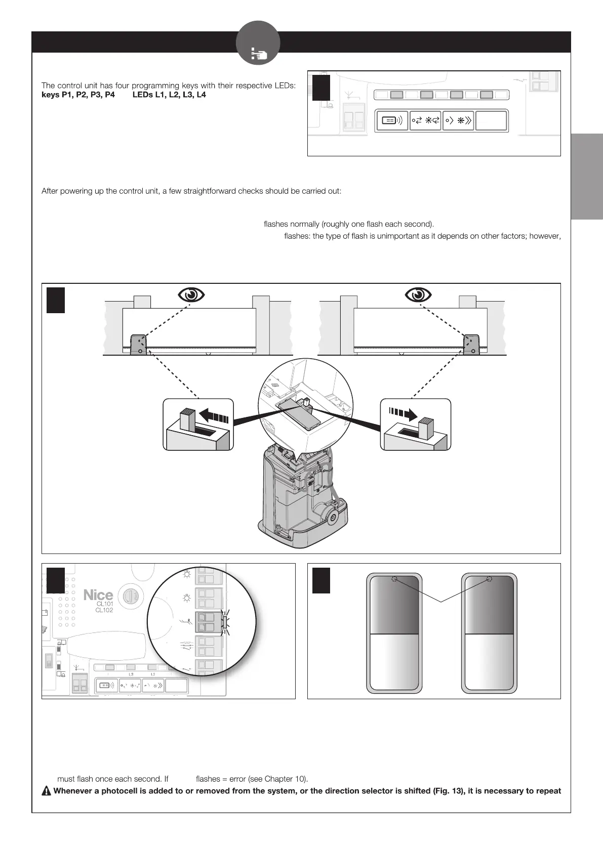 01. Depending on the gearmotor’s installation position ( to the right or left of the gate), shift the selector as shown in Fig. 13 to determine the gate’s