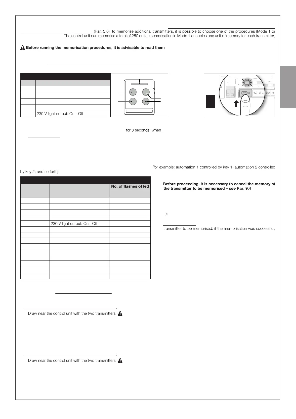 9.3.3 - Memorisation procedure near the control unit with two transmitters (without using the control unit keys)