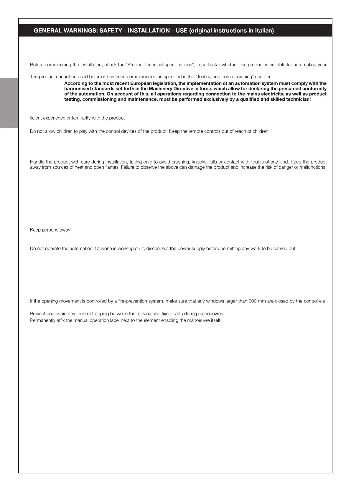 • After installing the drive motor, make sure that the mechanism, protective system and all manual manoeuvres operate properly