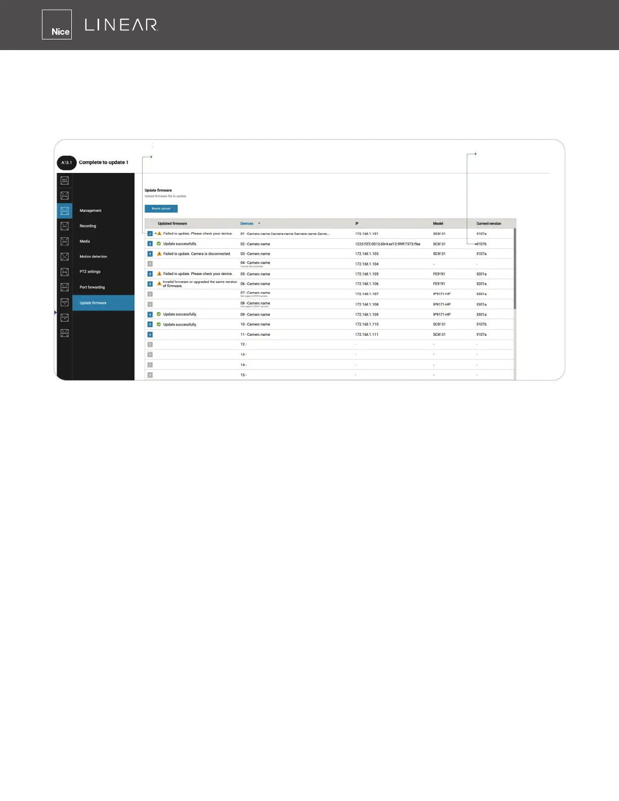 The Batch upload function allows you to update the rmware of multiple cameras� The rmware