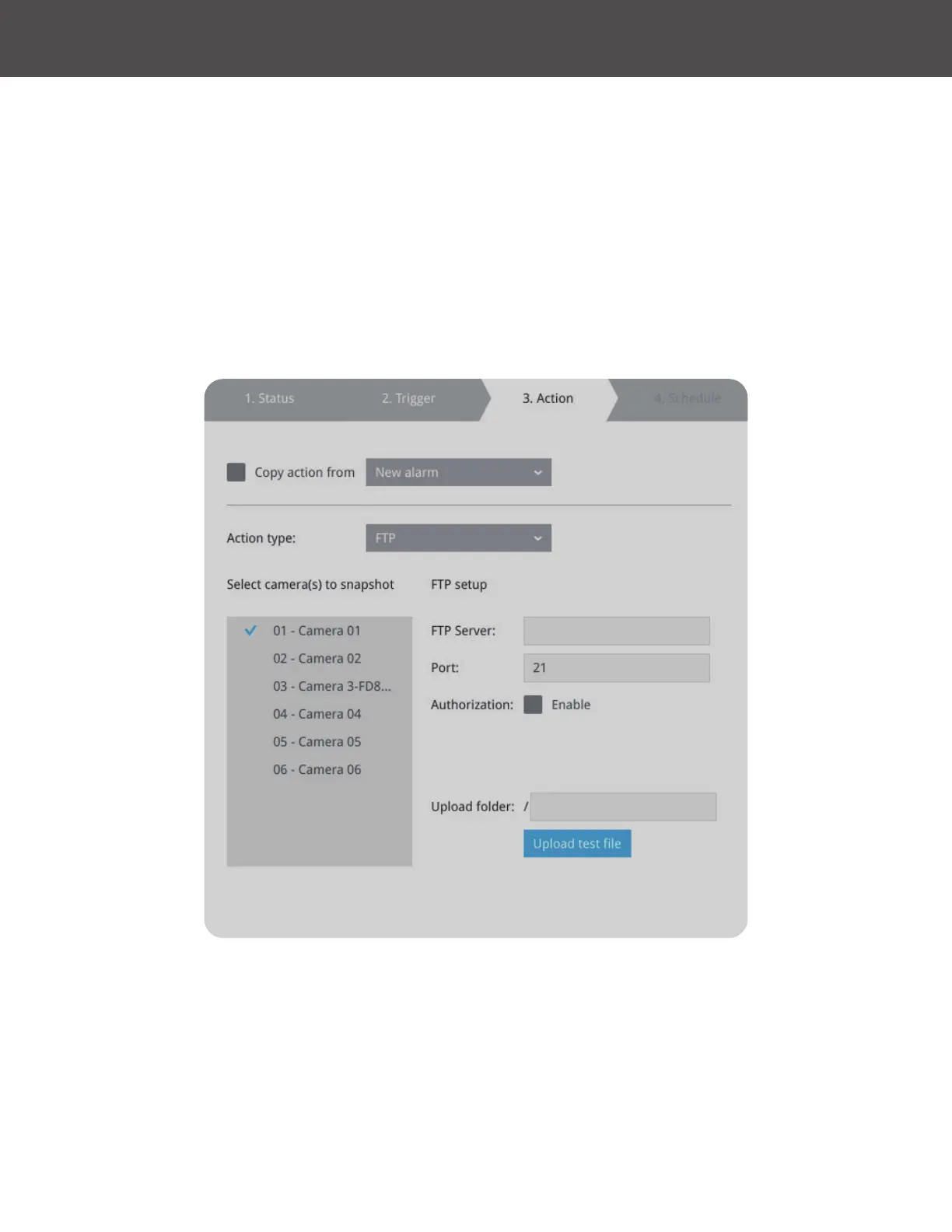 4-4� FTP: Snapshots from specified cameras can be uploaded to an FTP site on the