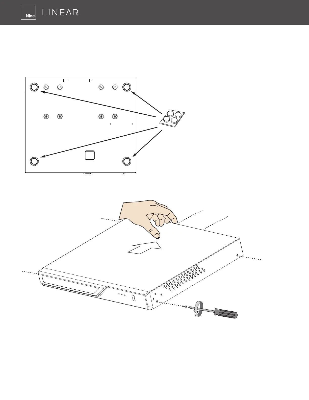 1� Attach four (4) foot pads to the bottom of the enclosure if the NVR is to be place on a desk