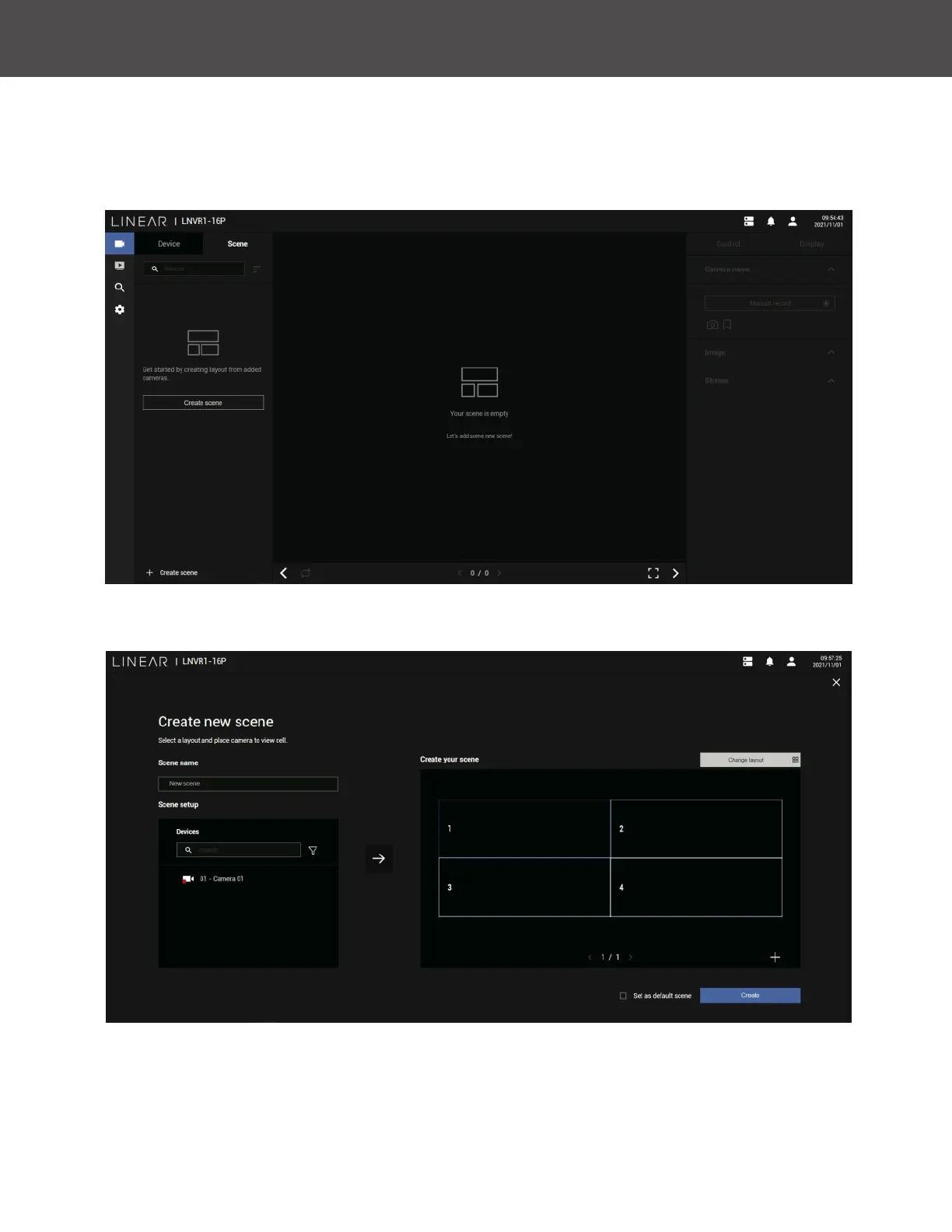A scene allows users to gather the live views from multiple cameras together into a comprehensive