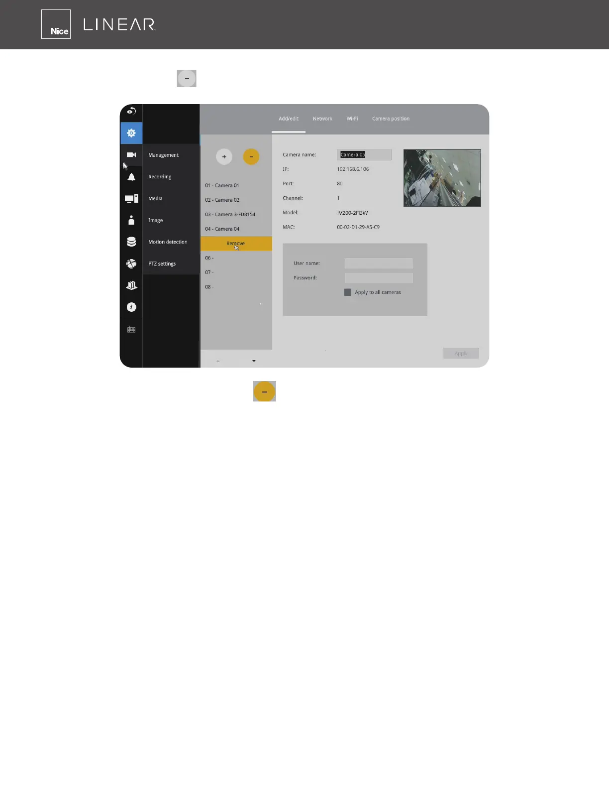 1� Click on the Remove button� A list of cameras will appear�