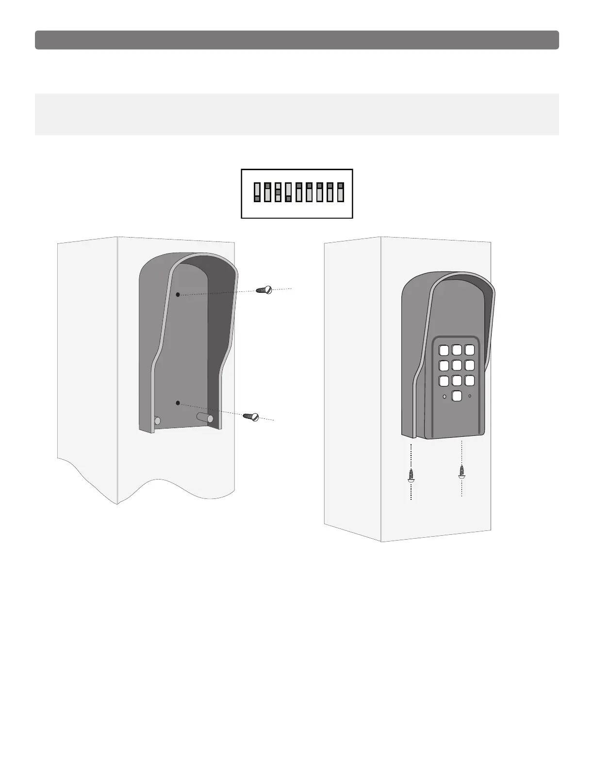 Step 1: Mount the keypad cover using the screws provided. Set the keypad DIP switches to match your entry