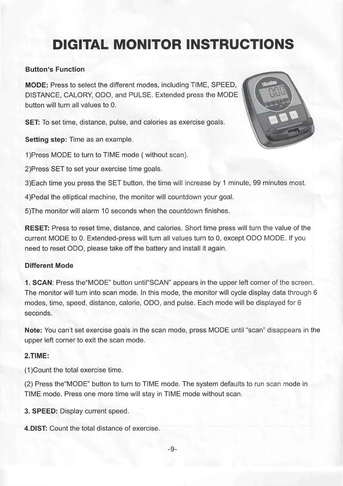 modes, time, speed, distance, calorie, ODO, and pulse. Each mode will be displayed for 6