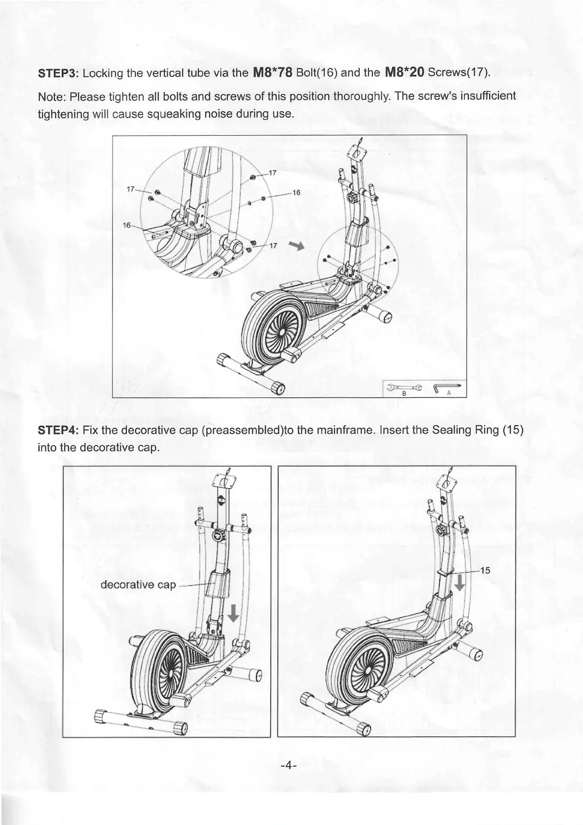 STEP3: Locking the vertical tube via the M8*78 Bolt(16) and the M8*20 Screws(17).