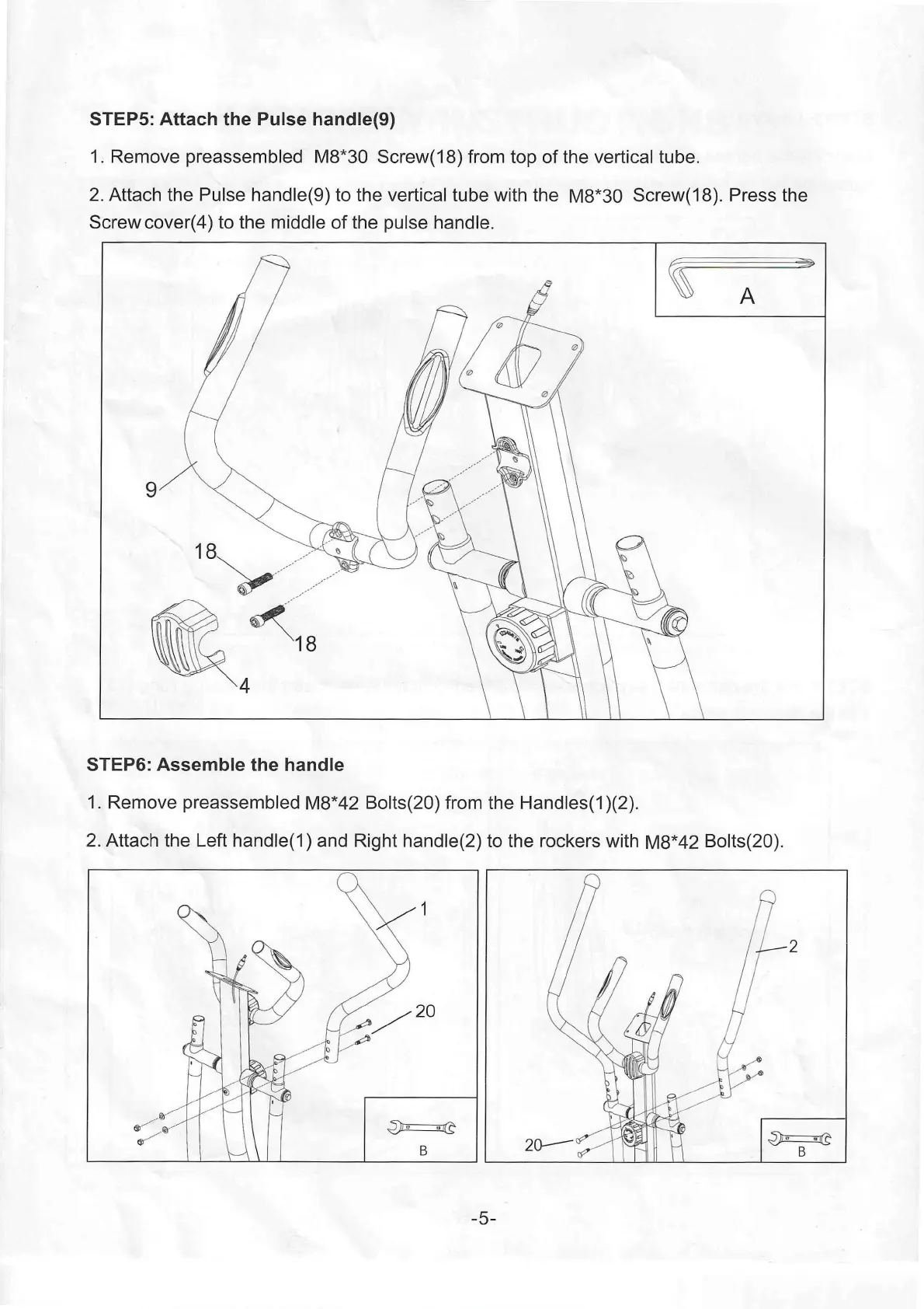 2. Attach the Left handle(1 ) and Right handle(2) to the rockers with M8*42 Bolts(20).