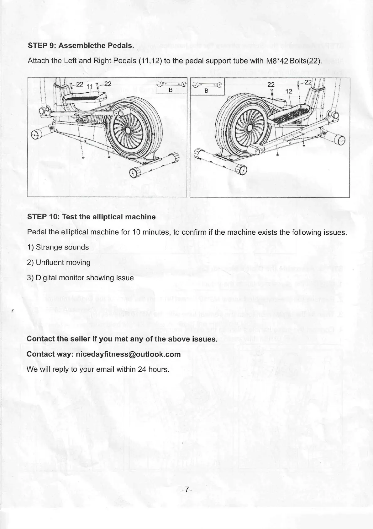Attach the Left and Right Pedals (11,12) to the pedal support tube with M8*42 Bolts(22).