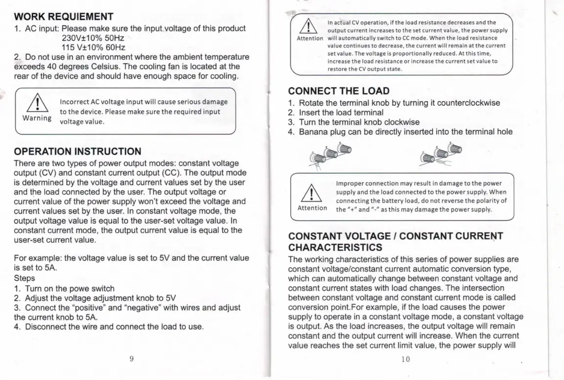 Nicepower R-SPS3010D - Operating Instructions; Work Requirements; Operation Modes; Connecting the Load