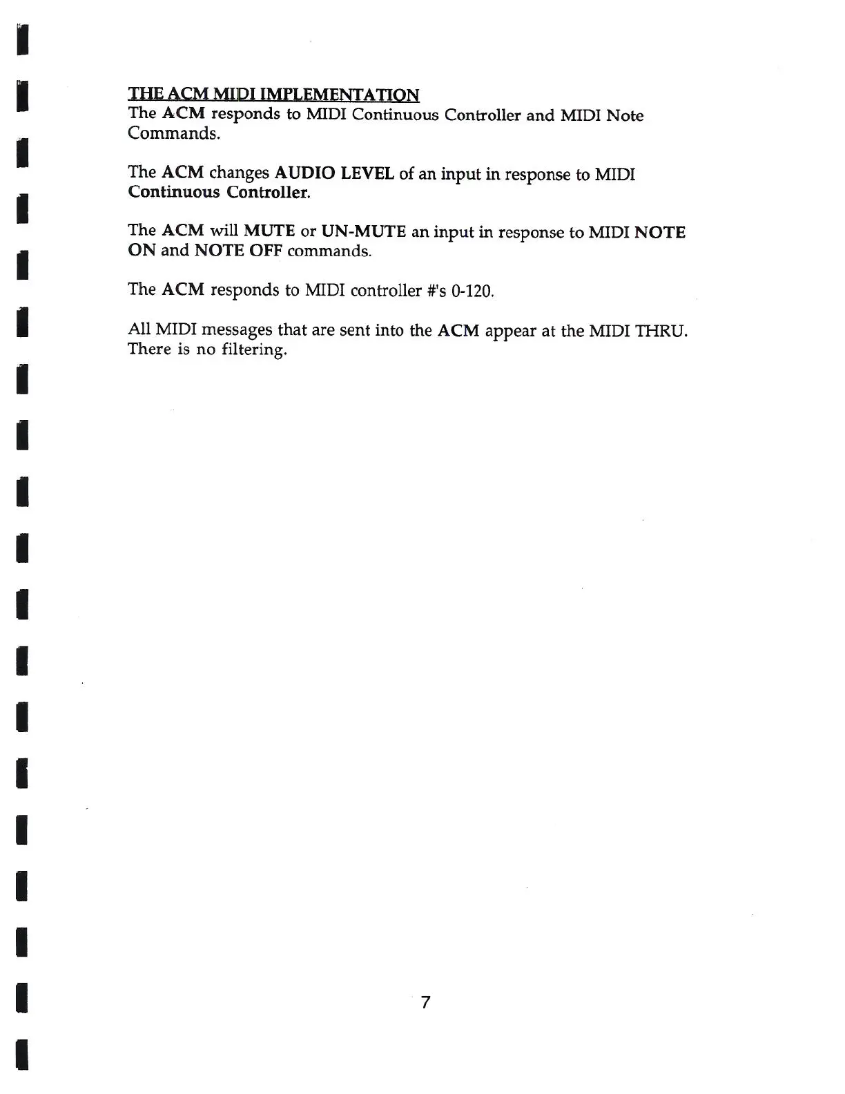 Niche ACM - ACM MIDI Implementation Details; ACM MIDI Command Handling; ACM Supported MIDI Controller Range; ACM MIDI THRU Port Behavior