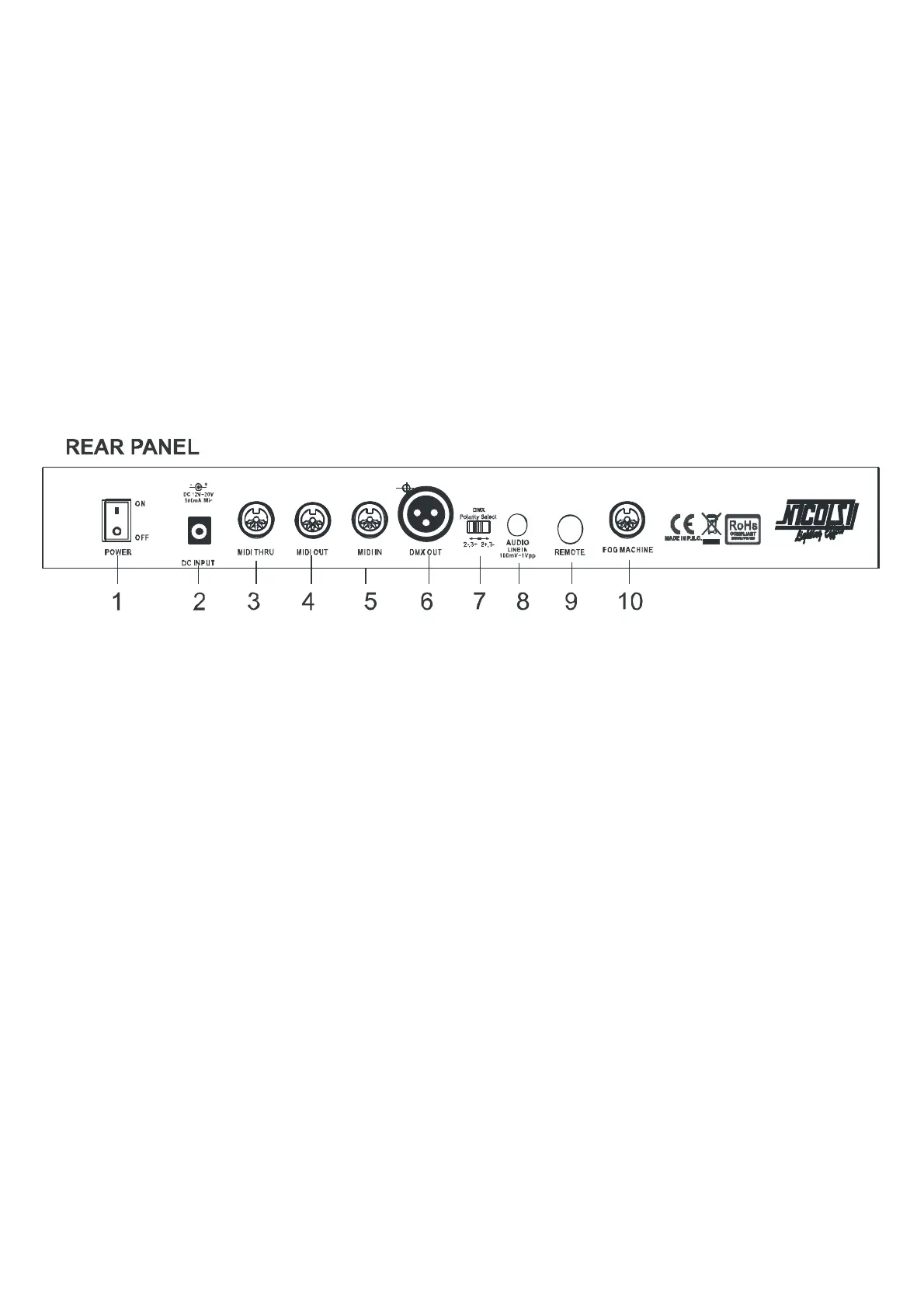 9. Control a distancia: Control a máxima potencia o de Black Out en conector JACK estándar.