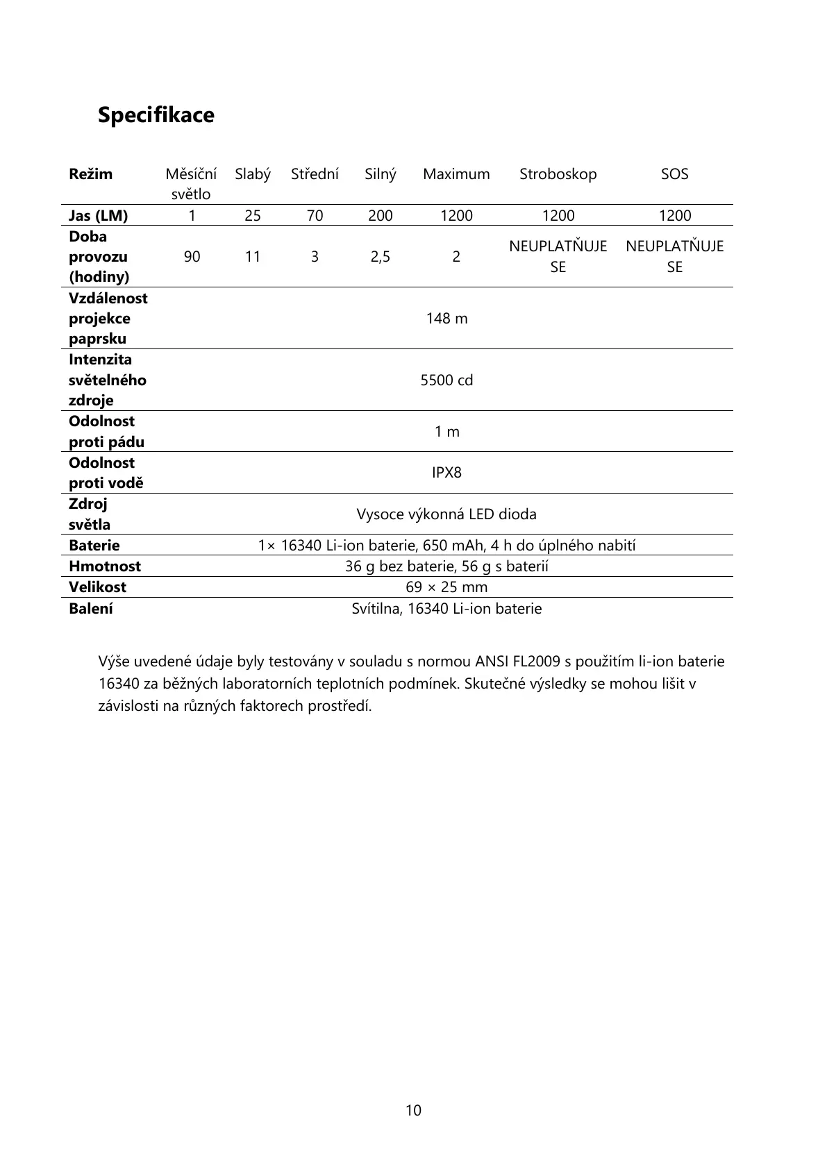 1× 16340 Li-ion baterie, 650 mAh, 4 h do úplného nabi