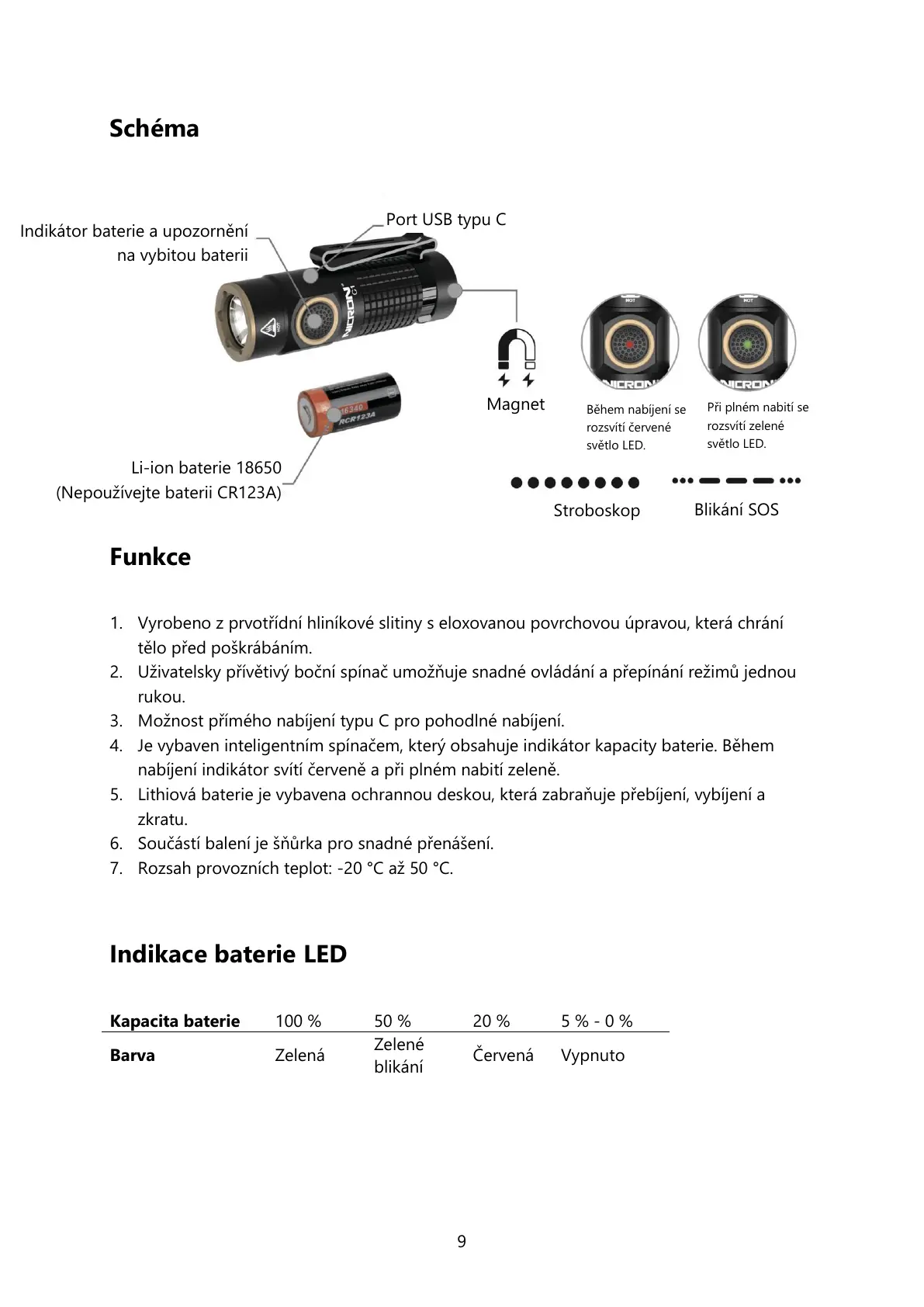 7. Rozsah provozních teplot: -20 °C až 50 °C.
