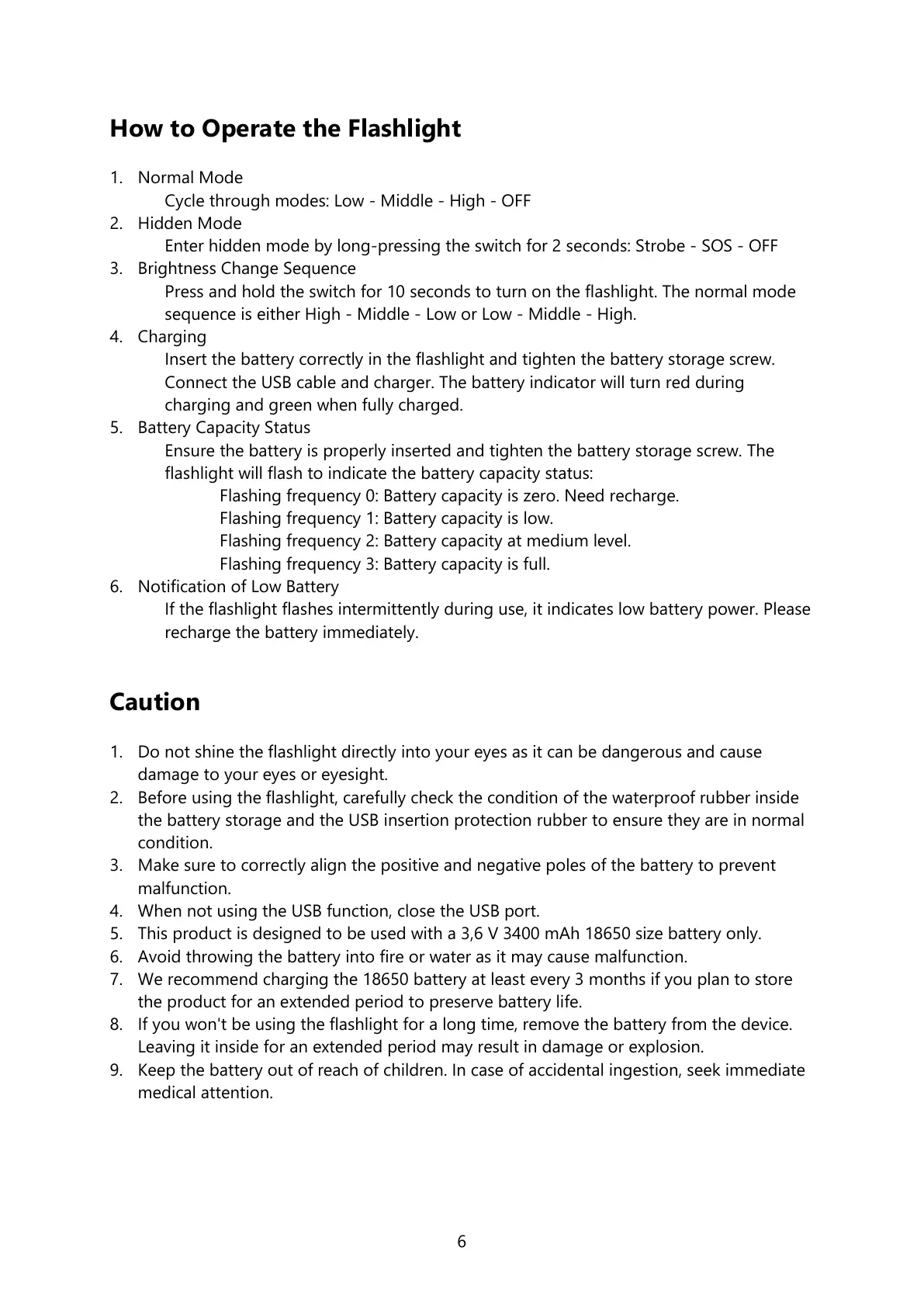 1. Do not shine the flashlight directly into your eyes as it can be dangerous and cause