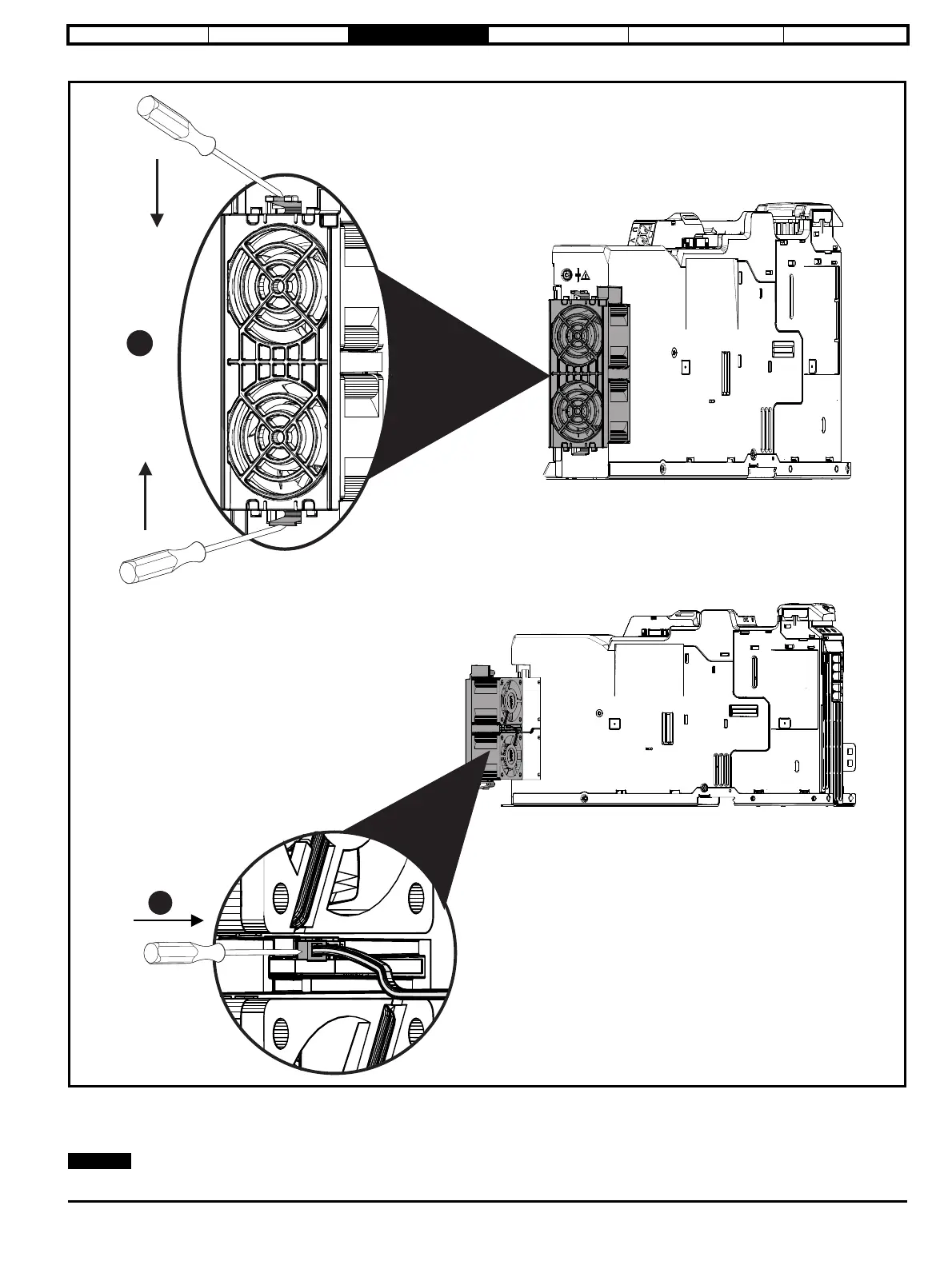 1. Using a flat bladed tool, press the two tabs inwards to release the fan from the drive frame.