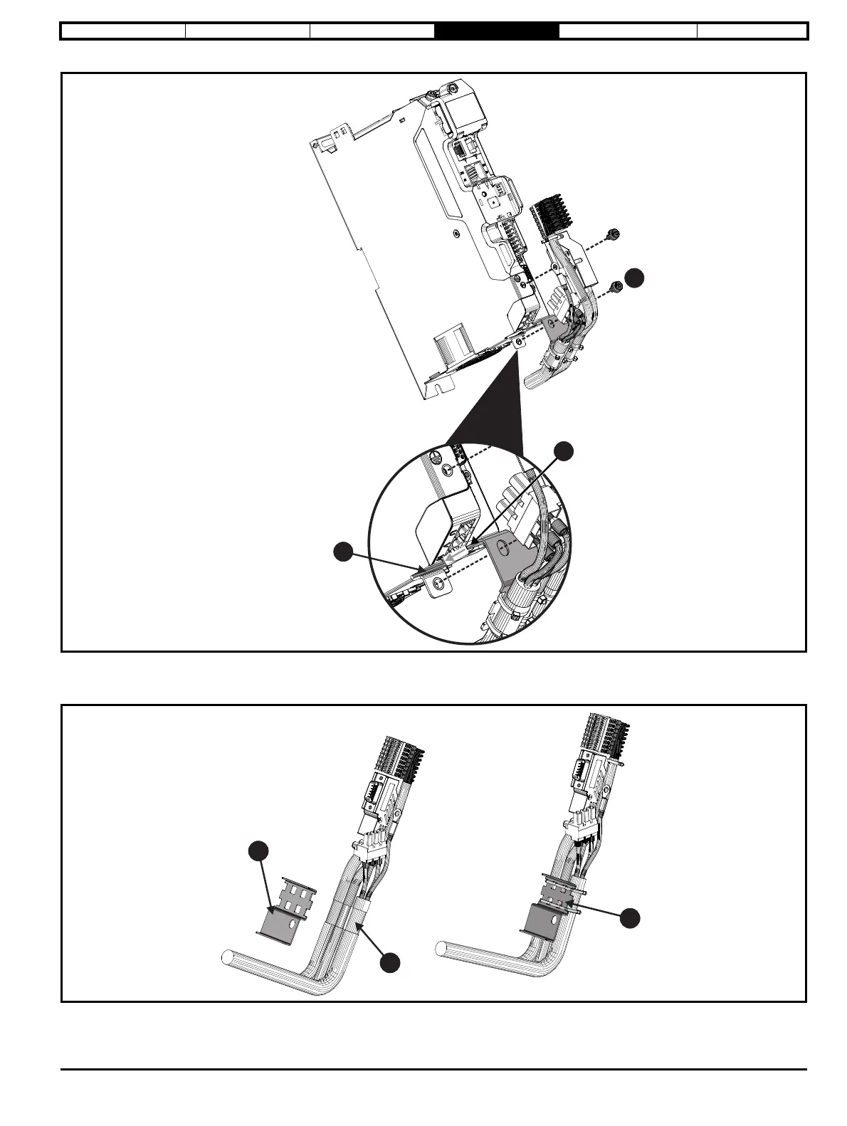 • The cable screen bracket (2) must be tie wrapped to the motor, feedback and control wiring (3).