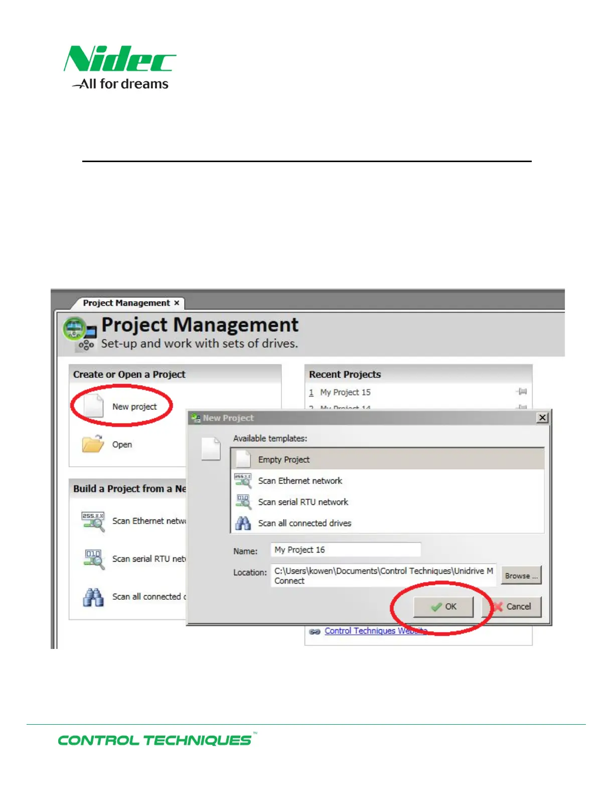 After opening the MConnect software select ‘New project’. Keep the default ‘Empty Project’ enter a